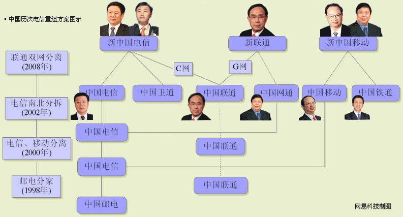 | ● 拆分中國聯(lián)通 2008年5月23日,中國電信收購中國聯(lián)通CDMA網(wǎng)(包括資產(chǎn)和用戶),中國聯(lián)通與中國網(wǎng)通合并,中國衛(wèi)通的基礎(chǔ)電信業(yè)務(wù)并入中國電信,中國鐵通并入中國移動。 |